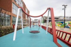 The new urban play space on Collin Street opened earlier this year, which features specially designed swings, a play trail with timber stepping blocks, balancing walkways, a seesaw and green planting.