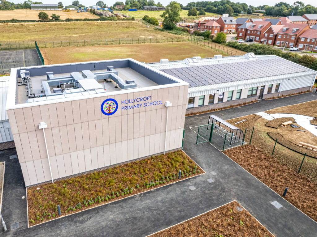 Hollycroft Primary School, completed in September 2023, was Leicestershire County Council's first Net Zero school designed for both regulated and unregulated energy use. This 210-place, 1,305m² primary school achieved BREEAM Excellent and placed in the top 10% of new non-domestic buildings for environmental best practice.